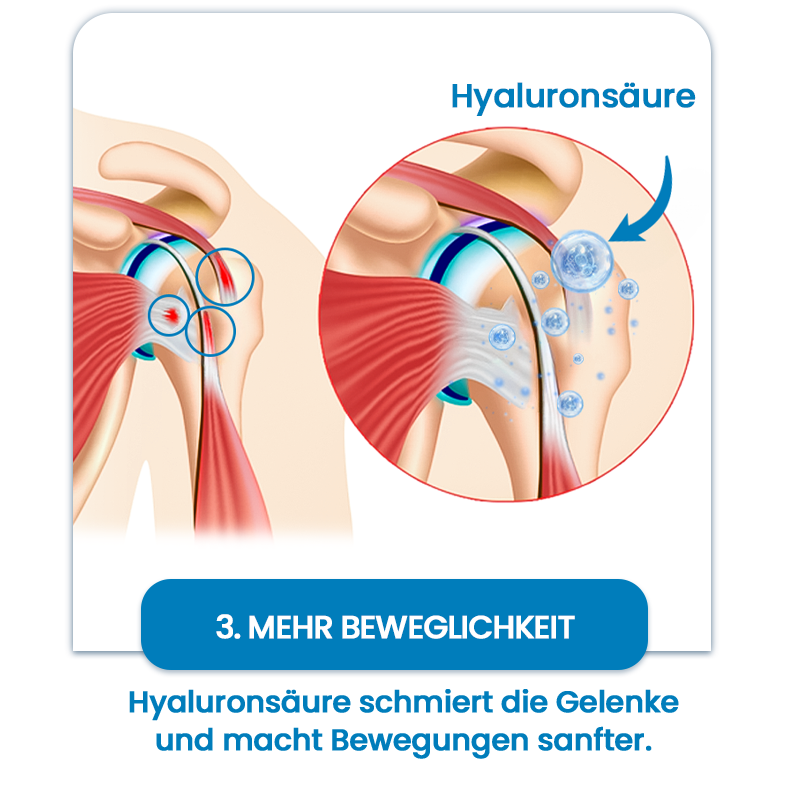 Viele Anwender berichten innerhalb von 5 bis 18 Tagen über weniger Steifheit und mehr Beweglichkeit. Die Hyaluronsäure hilft, die Schmierung im Gelenkgewebe wiederherzustellen – so entsteht nach und nach ein geschmeidigeres, freieres Bewegungsgefühl.