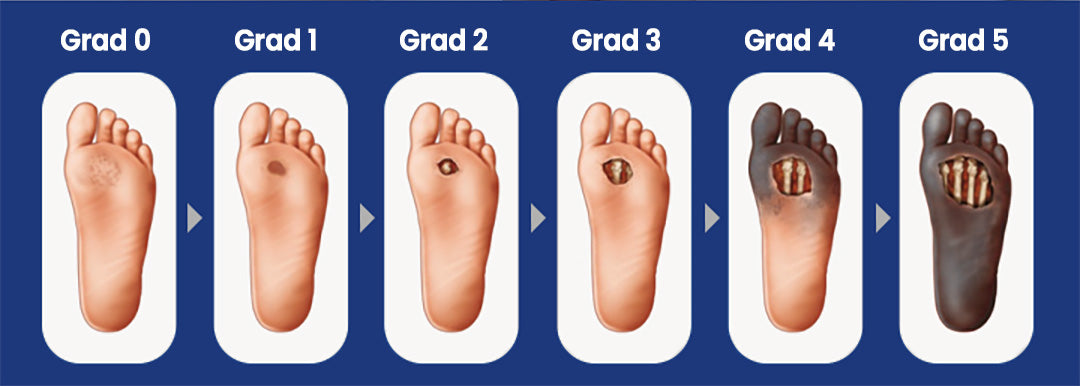Ein dauerhaft erhöhter Blutzucker kann die Nerven und Blutgefäße schädigen – selbst kleine Schnitte oder Druckstellen heilen schlechter. Das Risiko für Entzündungen und Geschwüre steigt.